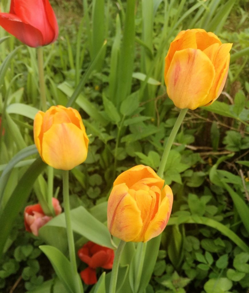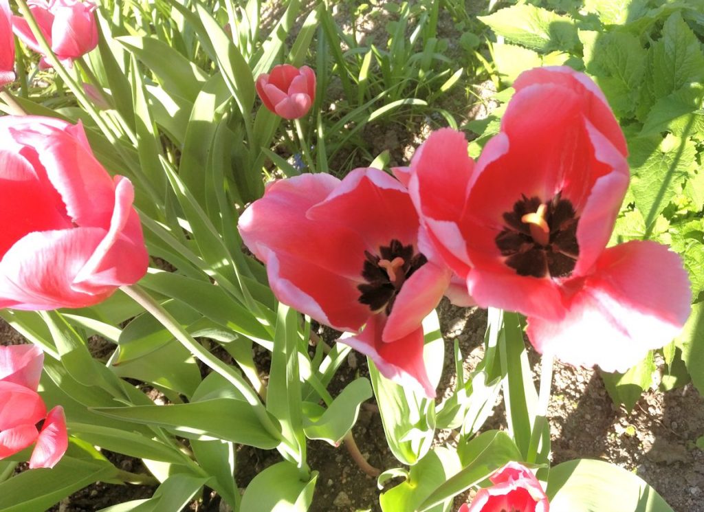 Siirtolapuutarhapalstan vanhaa tulppaanikantaa edustavat nämä punaiset kaunokaiset.