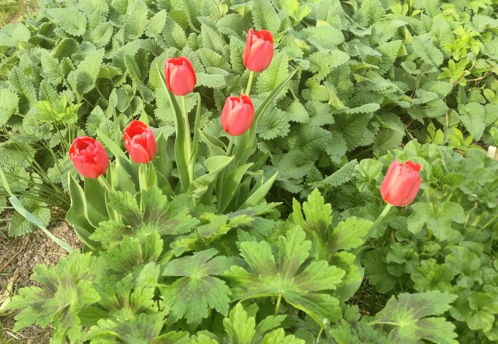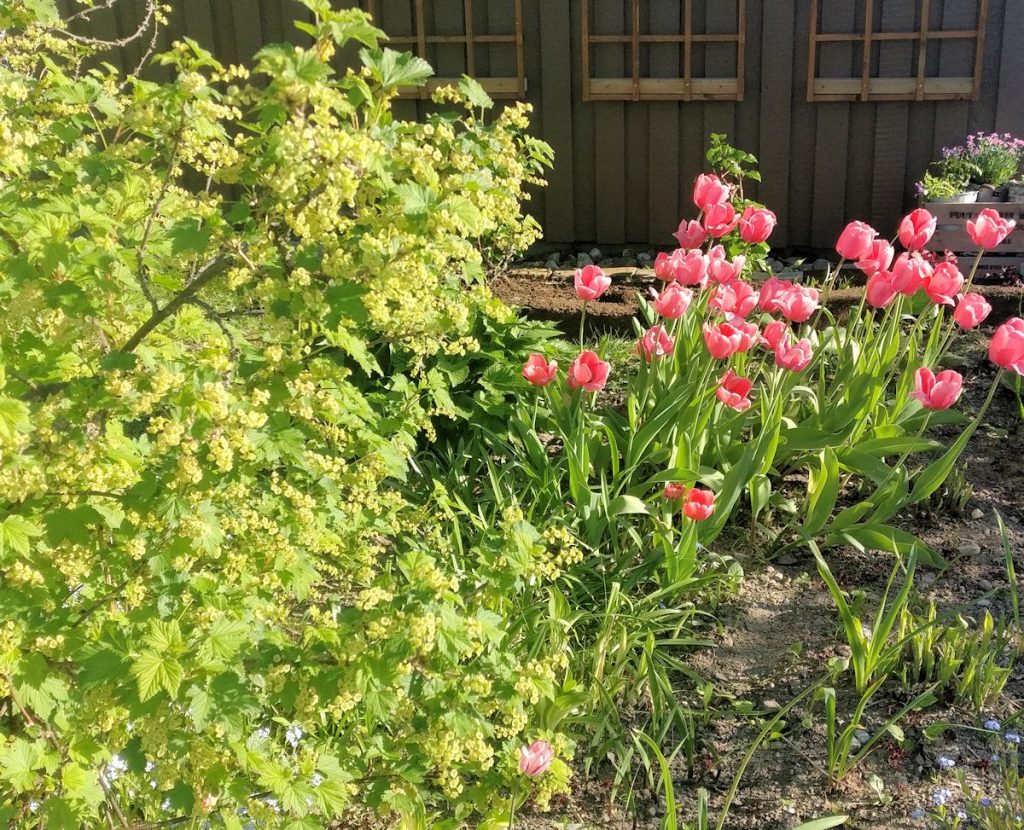 Punaviinimarjan ylenpalttista kukintaa ja jättimäisiä Darwin tulppaaneja.