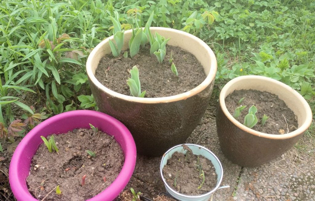 Syksyinen sipulien istutus ei mennyt tietenkään kokonaan niin kuin Strömsössä. Keväällä löysin mökin sisältä laatikollisen istuttamattomia sipuleita. Sipulit olivat ihme kyllä säilyneet elossa kylmillään olleessa mökissä ja pukkasivat jo vihreää kasvua. Istutin sipulit pihalle ruukkuihin, katsotaan kuinka niille käy.
