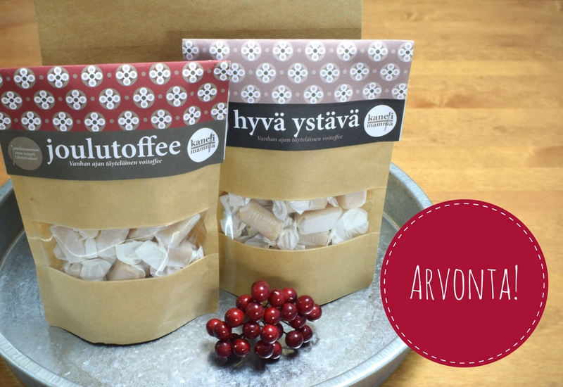 Voit osallistua arvontaan tykkäämällä Puutarhurin Majan Facebook-sivusta ja kertomalla kommenteissa kumpaa toffeeta haluaisit voittaa. Voittaja saa kaksi pussia valitsemaansa Kanelimamman suussa sulavaa voitoffeeta. Arvonta suoritetaan 19.11.2017.