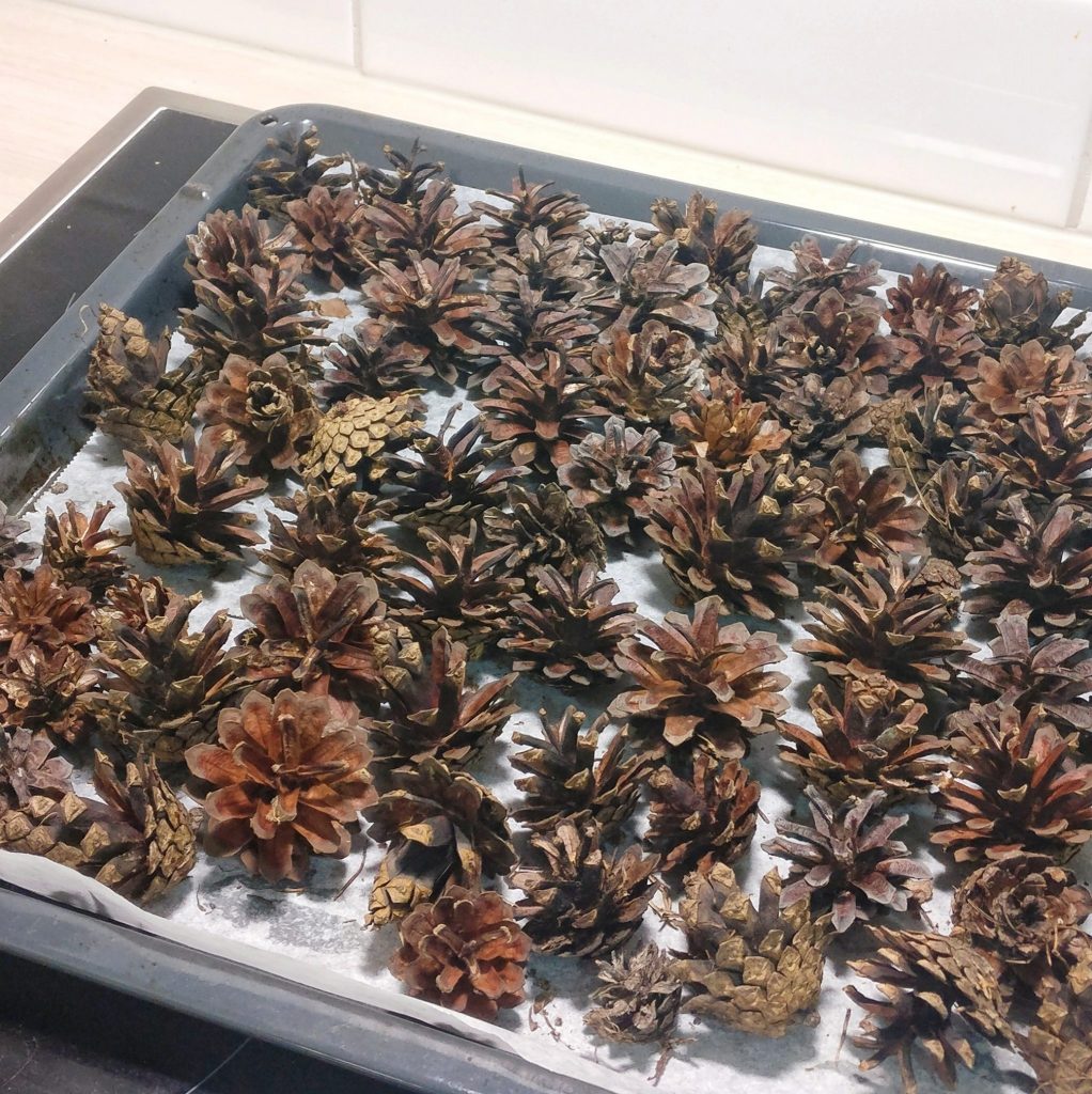 Kävyt hyasinttiin keräsin jo aiemmin syksyllä. Märät kävyt kuivuivat uunissa ja aukenivat mukavan muhkeiksi. Hyasinttiin ostamani spray-maali ei toiminut toivomallani tavalla. Jouduin maalaamaan kävyt pihalla ja luulen, että ulkoilma oli liian kylmä maalille. Lopulta kävyt saivat kivan violetin värin ihan tavallisesta purkkimaalista. Maalatut kävyt kiinnitin kuumaliimalla harjanvarresta katkaistuihin keppeihin. Parhaita ovat pienet täysin auenneet kävyt. Ruukkuun laitoin täytteeksi rutistettua voimapaperia. Ruukun voisi tietenkin täyttää myös vaikka pienillä kivillä tai hiekalla. Pinnalle tuli vielä kerros sammalta ja kanelitangoista tehty pieni koriste.