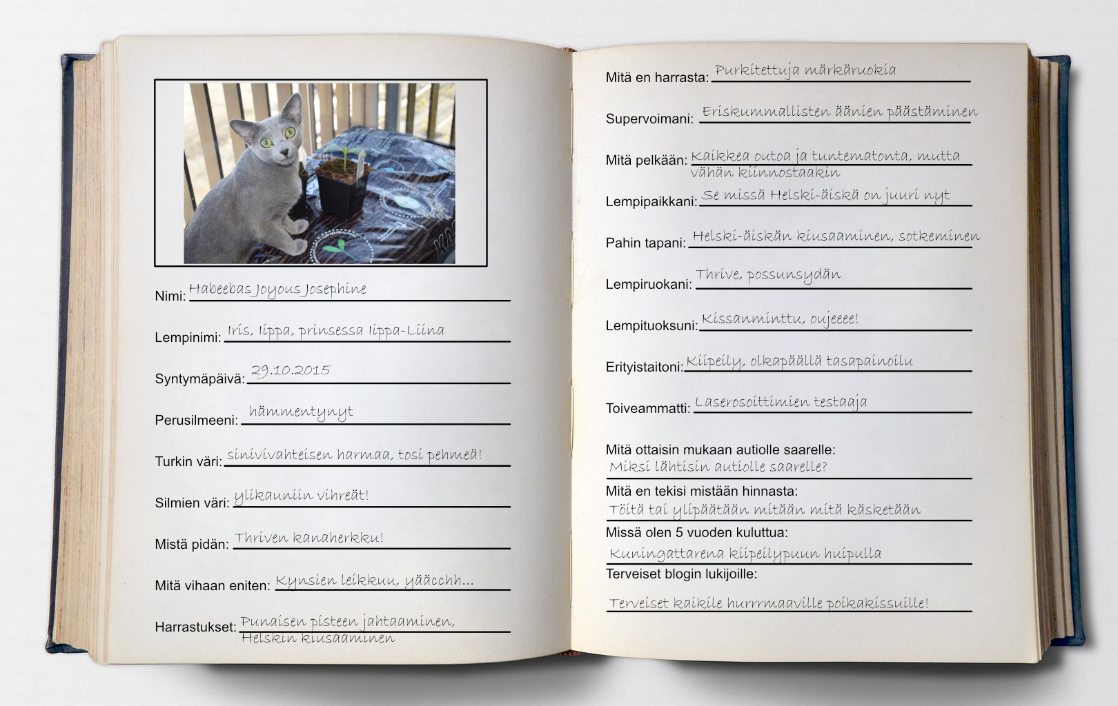 Iippa tekaisi synttäreiden kunniaksi myös ystäväkirjan ja täytti itse ensimmäisen sivun. Iippa haluaisi uusia ystäviä ja toivoisi, että myös muut kissat ympäri Suomen esittelisivät itsensä kommenteissa.