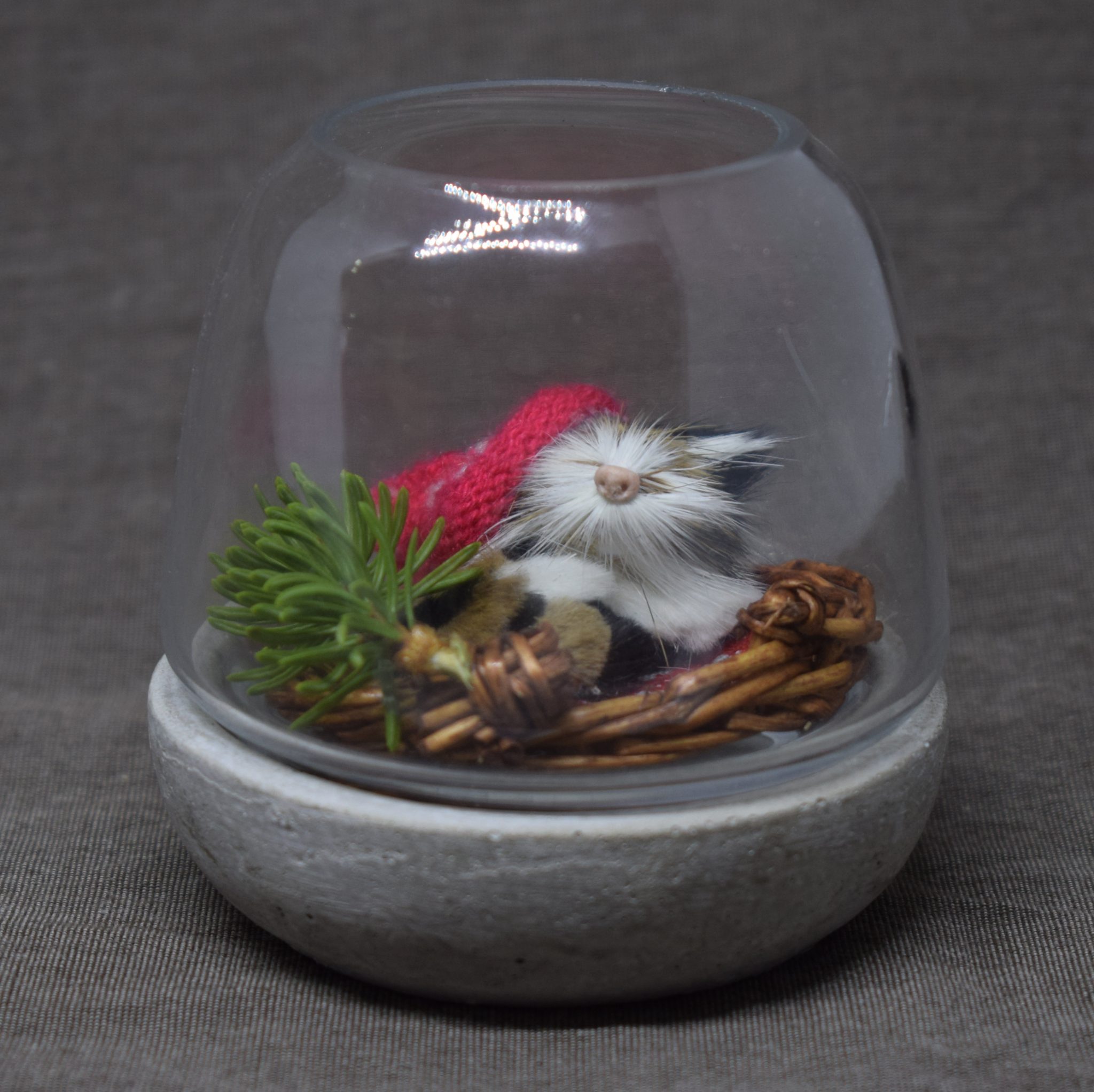 Tuikkulyhdyn miniatyyriasetelma, johon laitoin pikkuisen joulukissan.