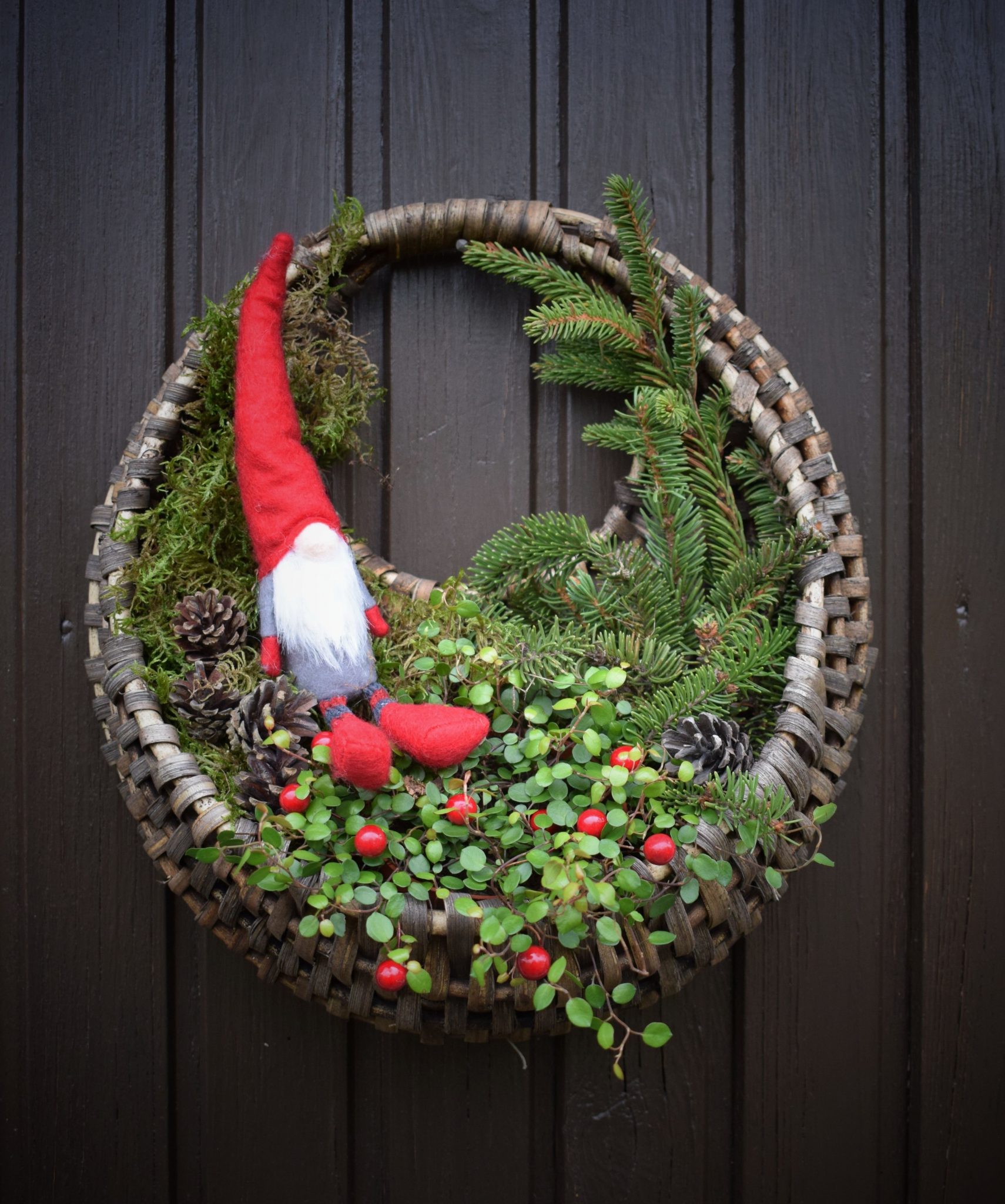Tämä mökin mukana tullut kori on aivan ihana pohja oven vaihtuville asetelmille.