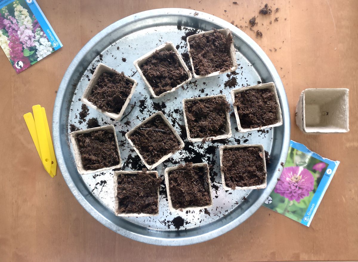 Kasvusammalkokeiluun pääsivät Cottage Garden henkiset kukkaset: tsinnia, tarhaleukoija ja laventeli.