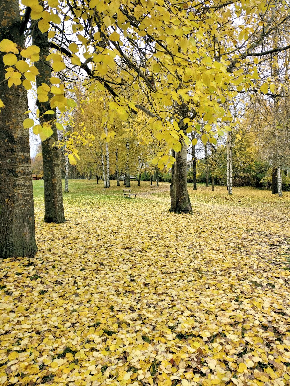 Nekalan siirtolapuutarhan vieressä on pieni Vinninpuistikko. Pitkänmallisen puistikon läpi kulkee kiva kiemurtelava polku. Puiston laidalla kasvavat haavat olivat pudottaneet lehtensä maahan kauniiksi keltaiseksi matoksi. Tästä näystä oli pakko napata kuva mennessämme majalle. Syksyisen hetken kauneuden täydensi puissa jäljellä olevien haavanlehtien rauhoittava havina.