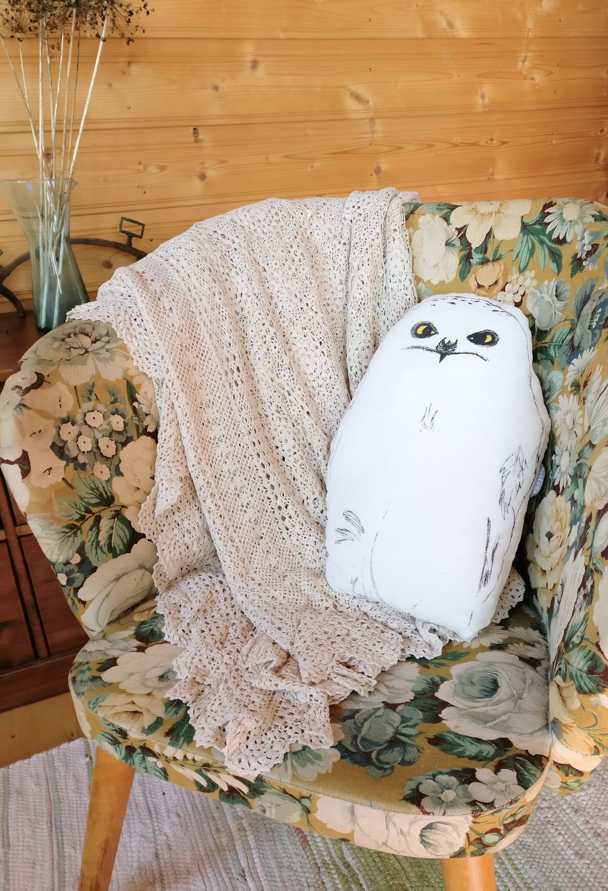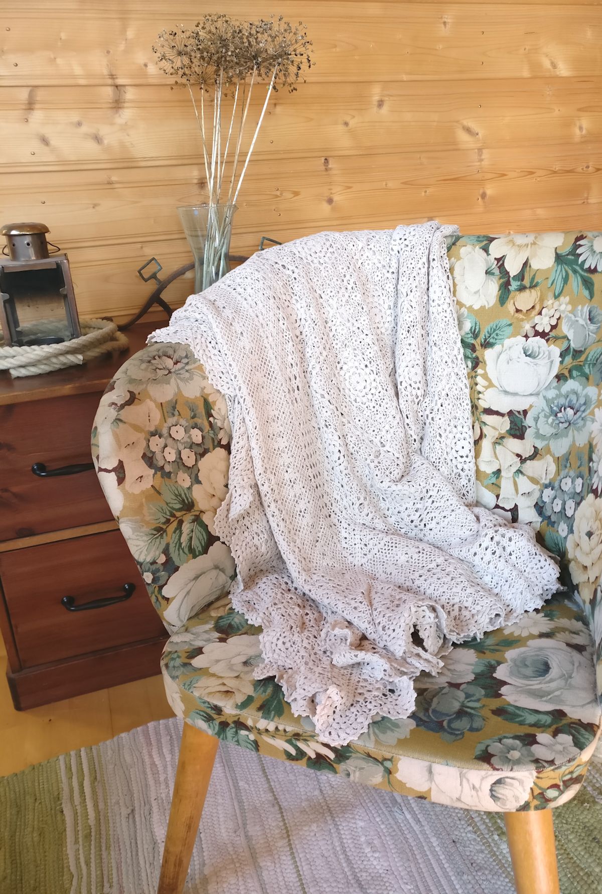 Pitsipeitto sopii nätisti uuden tuolin kanssa. Pitsipäiväpeitto on vuosien takainen kirppislöytö.