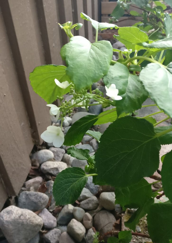 Viime kesänä varjopuutarhan seinustalle istutetut köynnöshortensiatkin ovat avaamassa vielä varsin vaatimattomia kukkiaan. Muutaman vuoden kuluttua tuosta köynnöshortensiaritiliköstä tulee vielä tosi upea!
