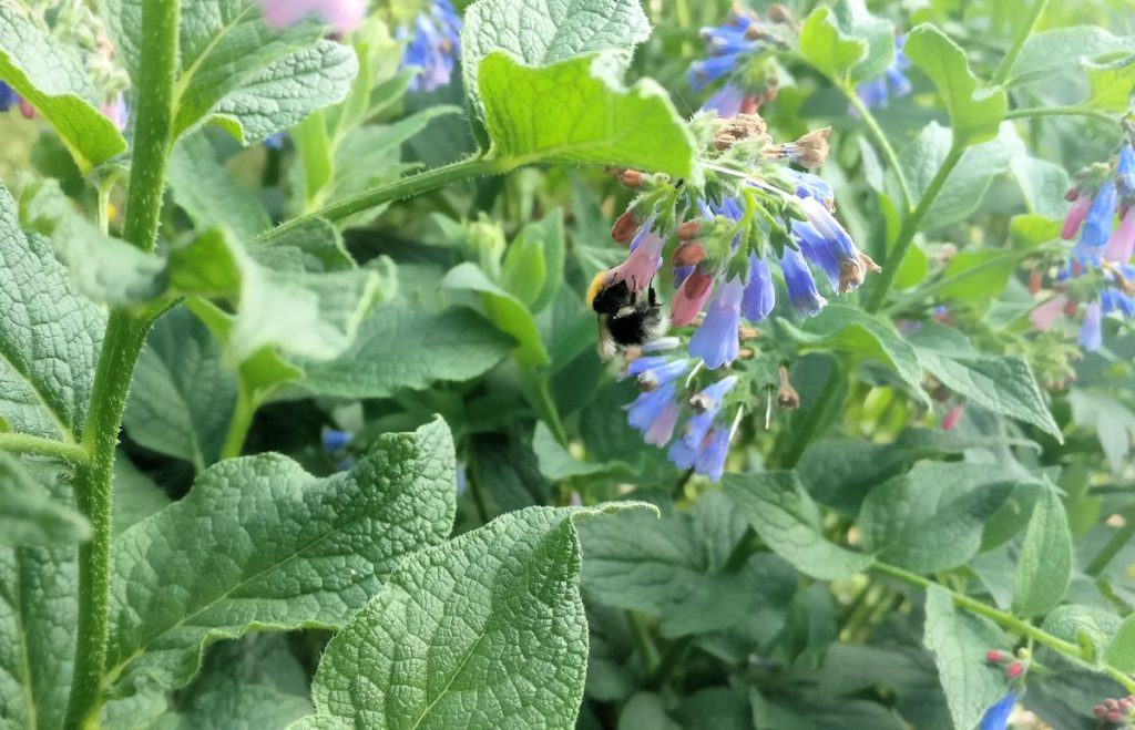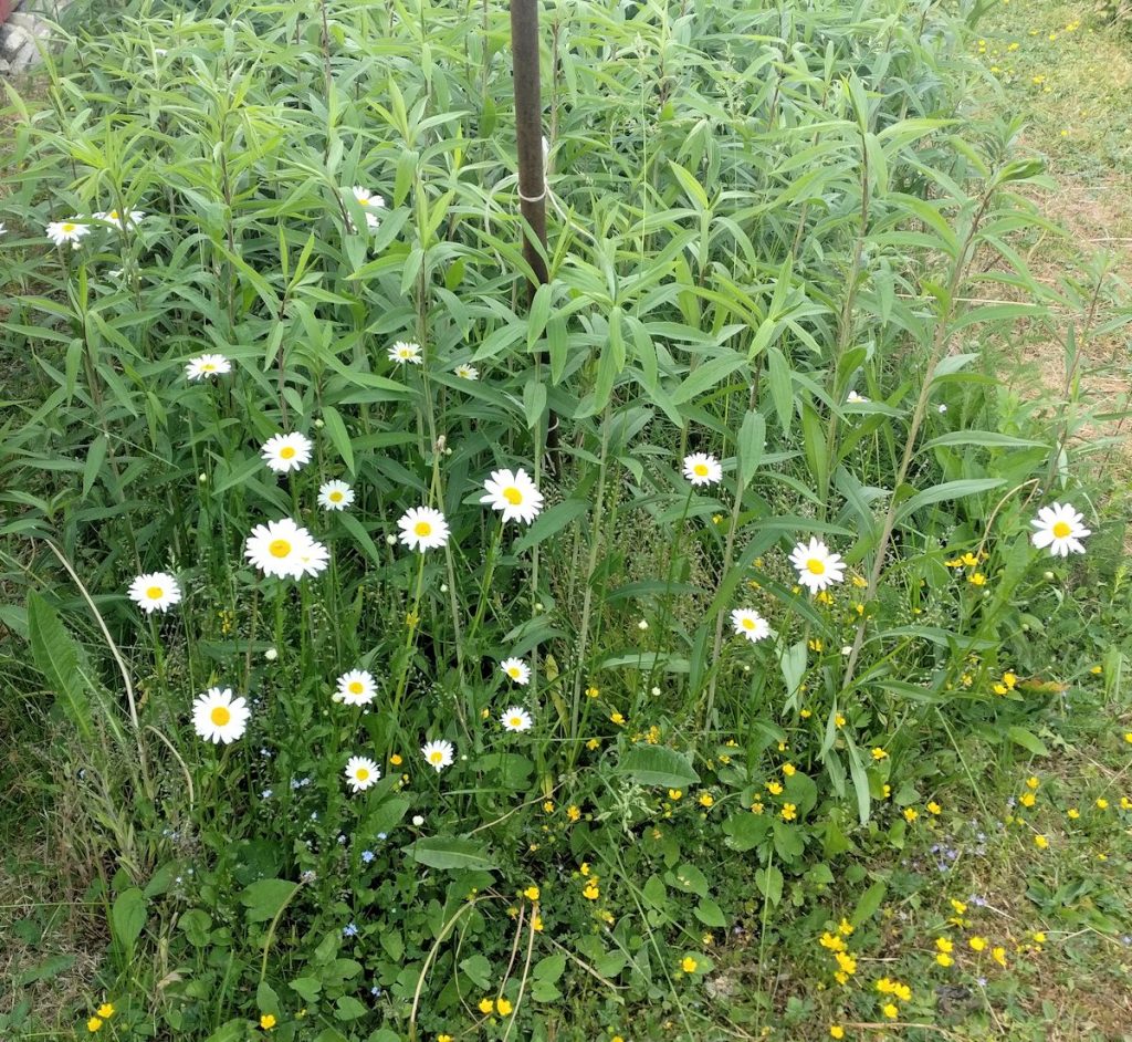 Jalopähkömökin on availemassa kukkiaan. Pitkin puutarhaa kasvaa kauniita päivänkakkaroita. Rönsyleinikki on vallannut kuivuudesta kärsivän nurmikon ja hoitamattomat alueet. Mökin nurkalla kasvava suuri raunioyrtti on kimalaisten suuressa suosiossa. Piikikkäässä kukkakasvustossa parveilevien pölyttäjien takia palstan kulmassa sijaitsevalle vesipisteelle on syytä kiertää toista kautta.
