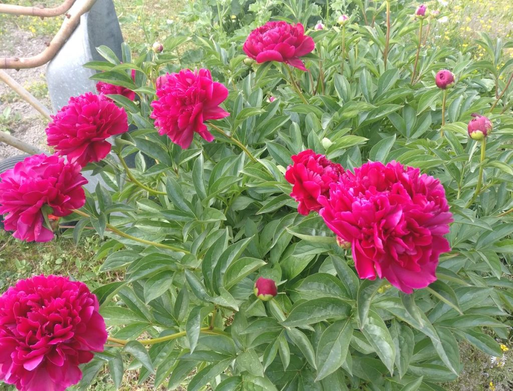 Pionit, jotka yleensä rehottavat, ovat tänä vuonna kasvaneet maltillisemmin. Eikä edes kukat ole niin suuria kuin yleensä. Sateettomuus lienee se suurin syy.