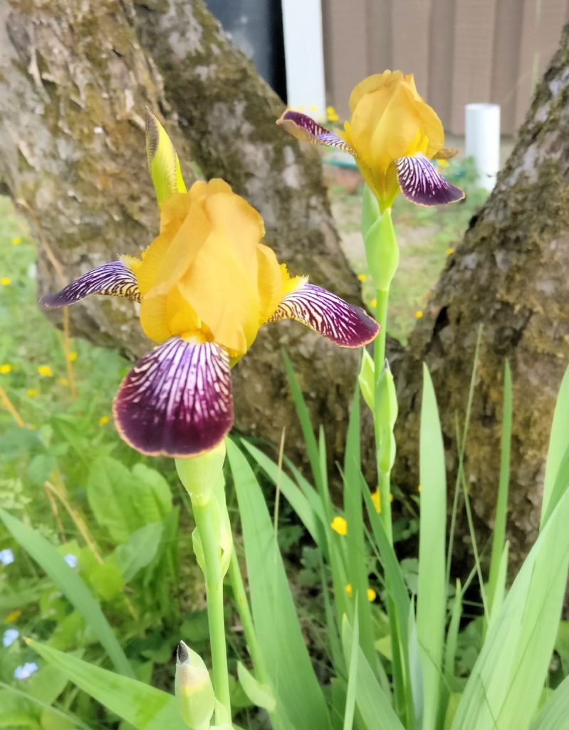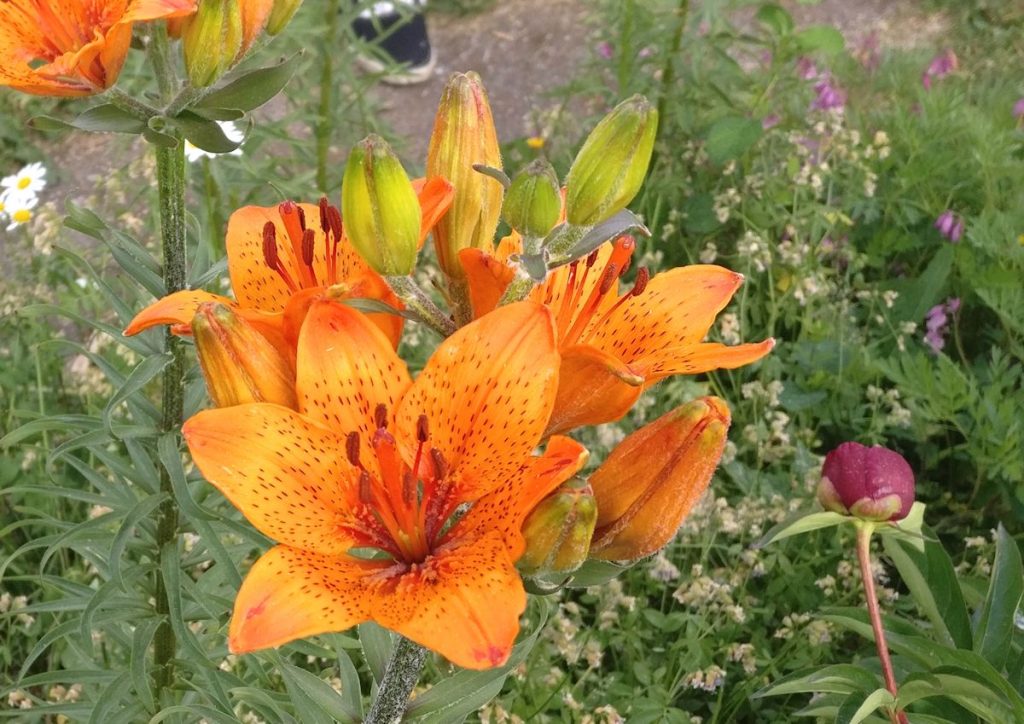 Ruskoliljat ovat juuri nyt kauneimmillaan. Tarha-alpi on vasta aloittelemassa kukintaansa. Puutarhasta löytyy myös muutama keltavioletti kurjenmiekka. Olisivatkohan tarhakurjenmiekkoja?