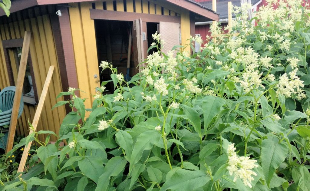 Vanhan varaston nurkalla röyhyää tatar viimeistä kesää.  Pienelle palstalle sopimaton tatar joutuu lähtemään. Siitä eroon pääseminen saataakin olla hieman hankalaa.
