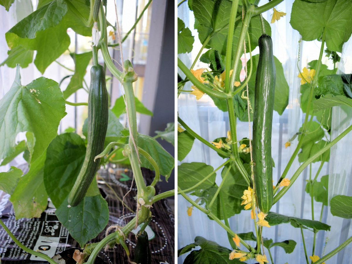 Kasvihuonekurkku Euphya (kuvassa vasemmalla) on tehnyt jo monta kurkkua. Eilen saimme vihdoinkin maistaa myös Tasty Greeniä (kuvassa oikealla). Molemmat kurkut kasvavat samassa kasvusäkissä lasitetulla parvekkeellamme. Tasty Green on kasvanut huomattavasti hitaammin, kuin Euphya. Tasty Greenissä on valtavasti kukkia, paljon enemmän kuin kaverillaan.