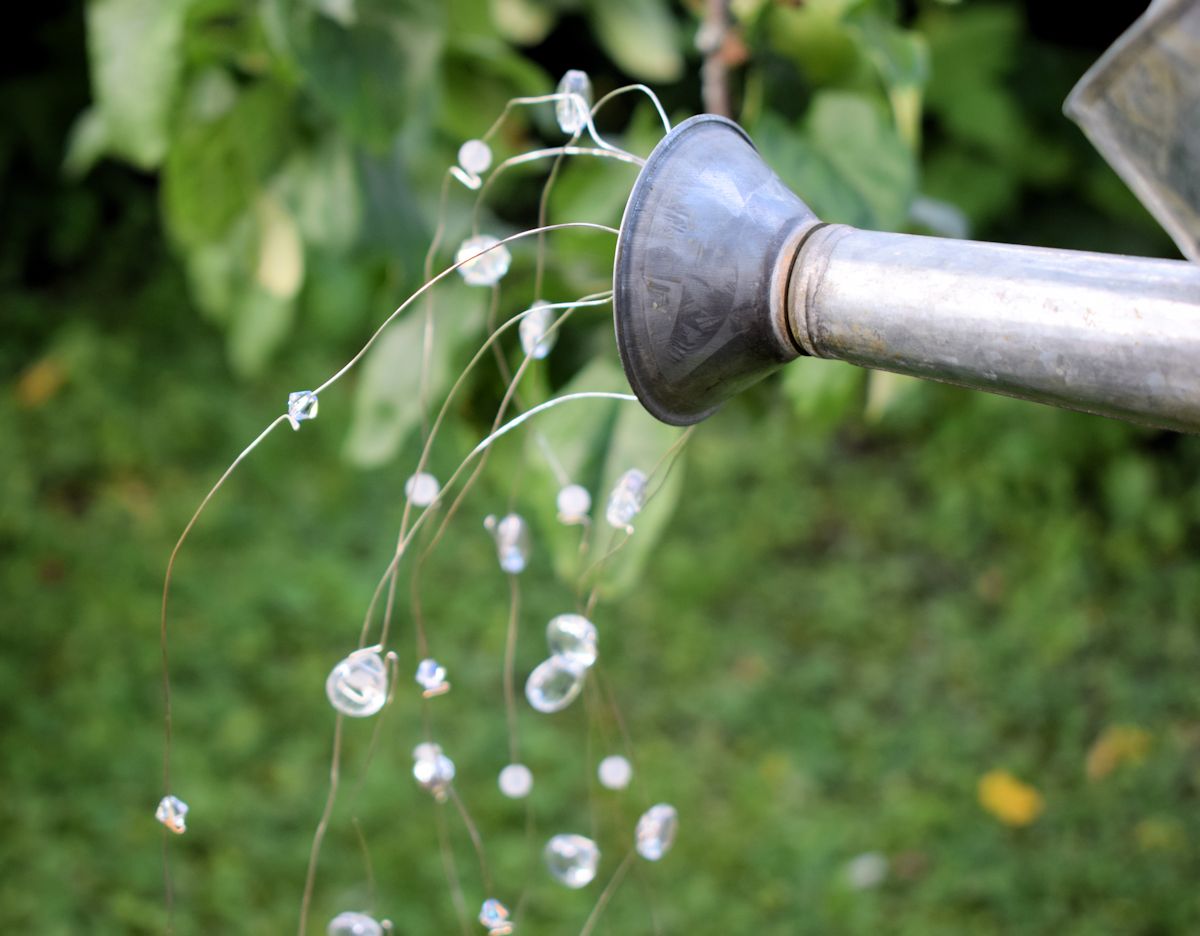 Kastelukannun tuunaus tarvikkeet: sinkkikastelukannu, helmiä ja ohutta rautalankaa.