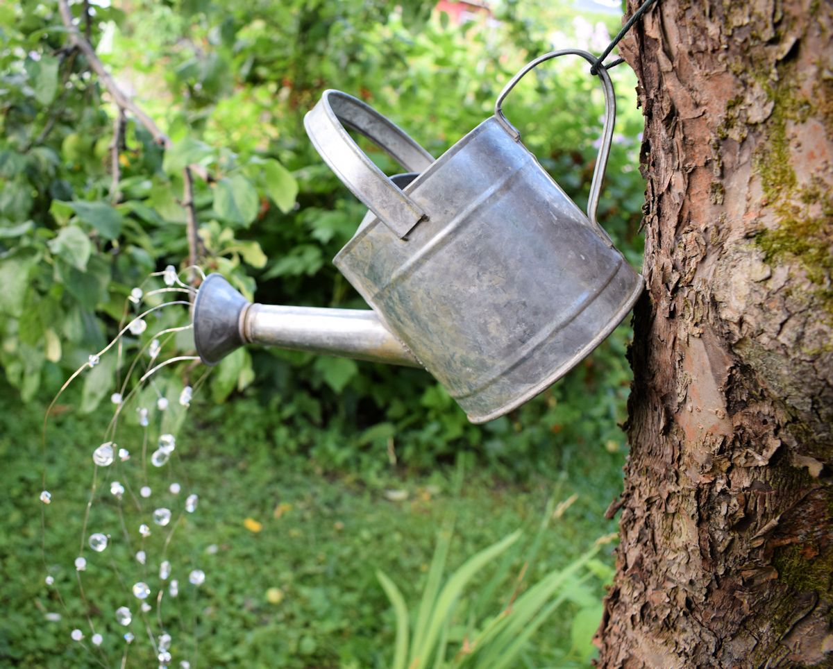 Sinkkinen kastelukannu omenapuussa.