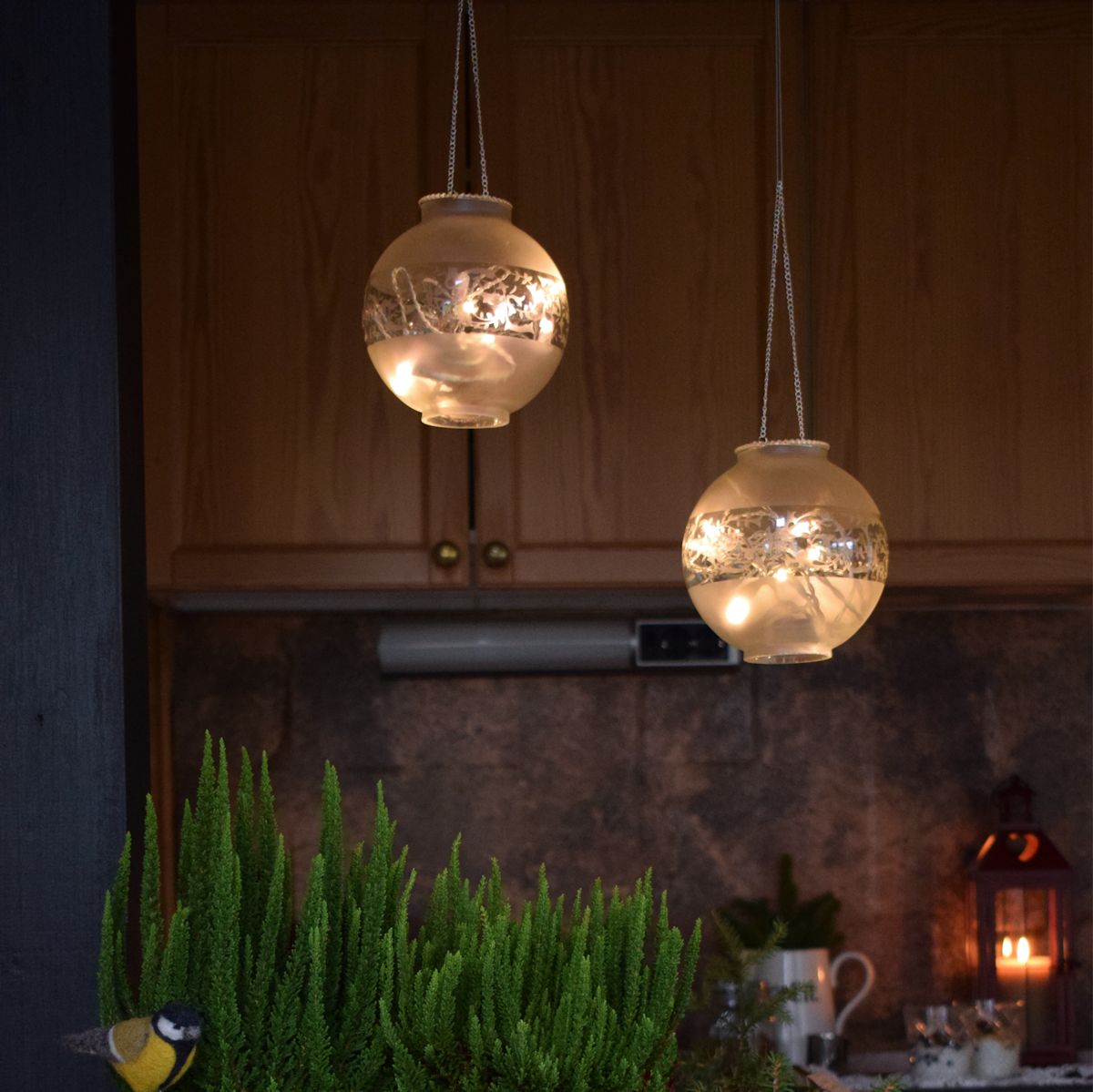Muistatteko vielä kukkatuolin kirppikseltä? Samalla kierrätyskeskusreissulla löytyi myös kaksi vanhaa lampunkupua. Kuvuissa on kauniit etsatut kuviot ja soma piparkakkureunus yläaukon ympärillä. Kuin tilauksesta toiselta kirppikseltä löytyivät Ikean patterikäyttöiset led-valosarjat. Sitten tarvittiinkin vain pala hopeanväristä koruketjua, ohutta metallilankaa sekä kaksi pientä soikeaa rengasta ketjun kiinnitykseen. Muutama minuutti näpertelyä, valot lyhdyn sisälle ja kierrätyslyhdyt olivat valmiit.