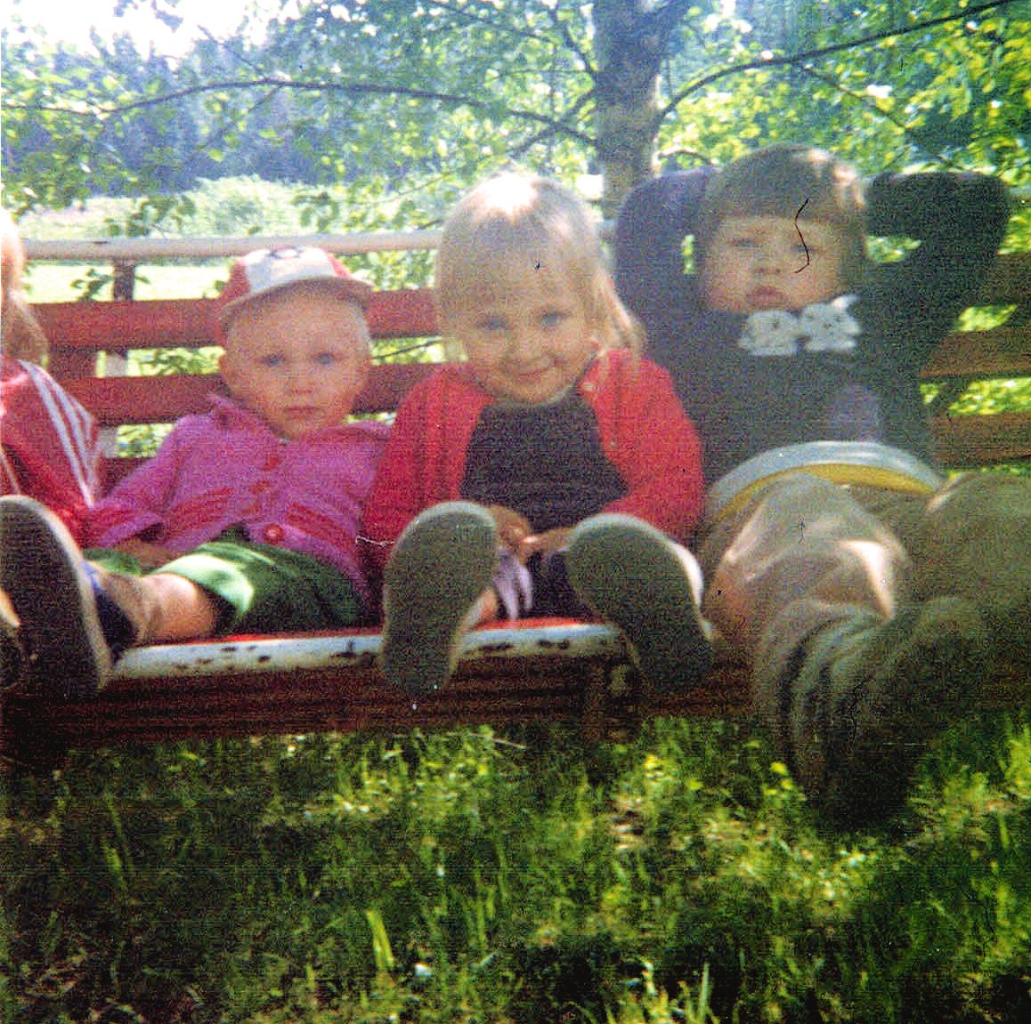 Mumman puutarha oli ihan pellon laidalla. Tässä on maltettu rauhoittua vähäksi aikaa pihakeinuun.