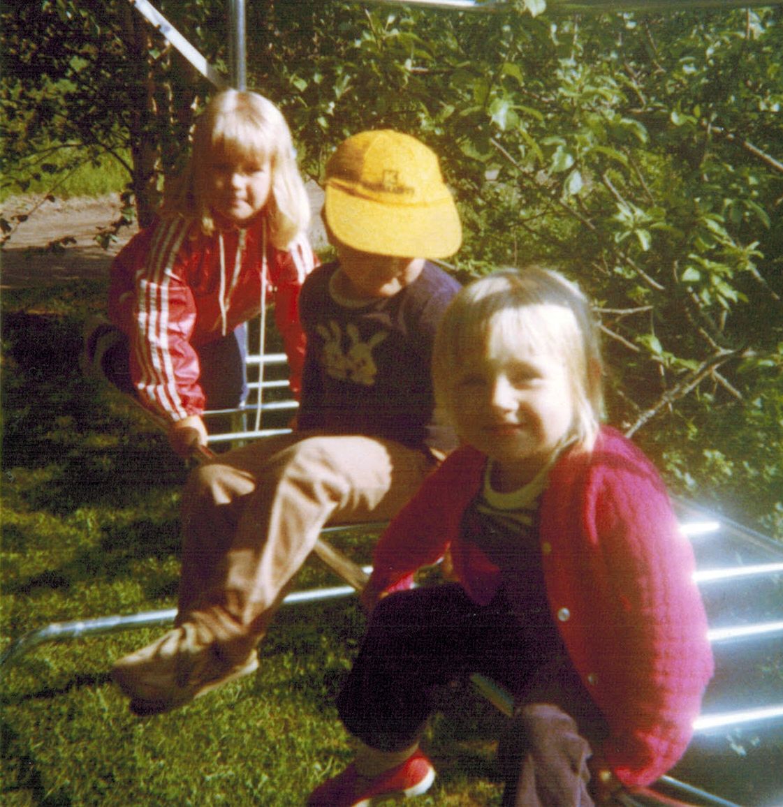 Peikonpoikaset mummolassa. Taka-alalta pilkistää mumman kukkapöytä, jolla oli ainakin saintpaulioita. Kommentoin tästä kuvasta Herra Puutarhurin Majalle, että miksi mulle on laitettu liian pieni paita päälle? Herra totesi, että ”onhan sulla nykyäänkin paidoissa liian lyhyet hihat.” Totta. Tykkään vajaamittaisista hihoista. 🙂