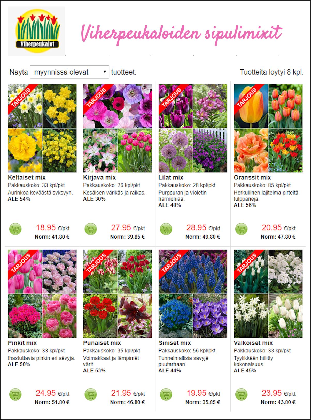 Viherpeukaloiden väki on osannut valita hulluuteen asti houkuttelevat sipulimixit tähän tarjoukseen! Vai mitä sanotte Pinkit mixistä: kerrottuja Angelique ja Diandra -tulppaaneja, Don Quichotte -tulppaaneja ja pinkkiä septemberglut -syysleimua? Tai lilat mixistä, jossa on Saigon -tulppaanien lisäksi Purple Lady -puuliljoja, Powder Puff -laukkoja ja jalokurjenpolvia. Ja näitä raikastamaan sopisi tietenkin valkoinen mix.