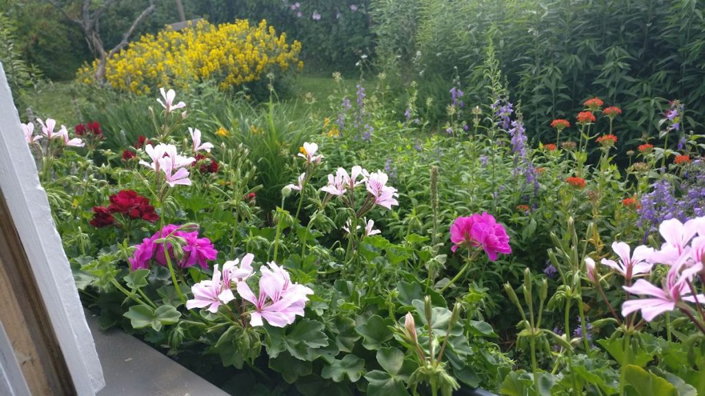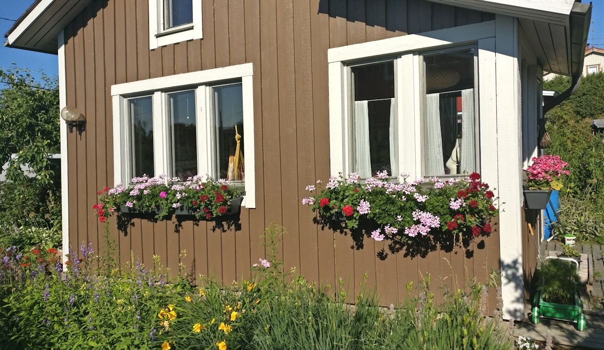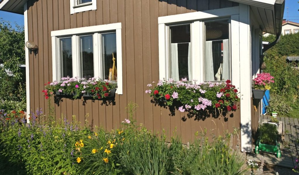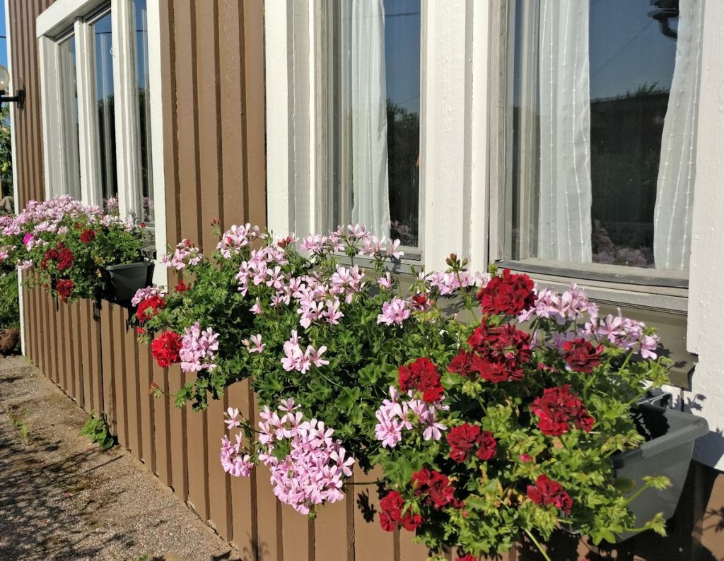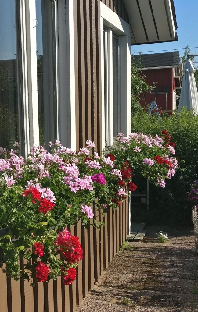 Helle näyttää sopivan toisille vallan mainiosti. Ikkunalaatikoiden pelargonit nauttivat lämmöstä ja kukkivat mökin seinustalla todella komeasti. Pelargonit ovat siitäkin ihania, että niiden jatkuvasta kastelemisesta ei tarvitse stressata kuumillakaan ilmoilla. Pelargonit eivät pistä pahaksi pientä kuivahtamista. Ihanteellisia mökin kesäkukkia siis! Tänä vuonna mökin laatikoissa on riippapelargoneja. Laatikoihin päätyi hieman jännä porukka. Seinustalla on nimittäin neljää eri väristä pelargonia. Värikimara ei ollut suunniteltu, tarkoitus oli hankkia vaaleanpunaisia pelargoneja kaikkiin laatikoihin, mutta kaupassa ei ollut laatikoihin tarpeeksi yhtä, kahta tai edes kolmea väriä. Sekoituksesta tuli lopulta tosi hauskan näköinen.