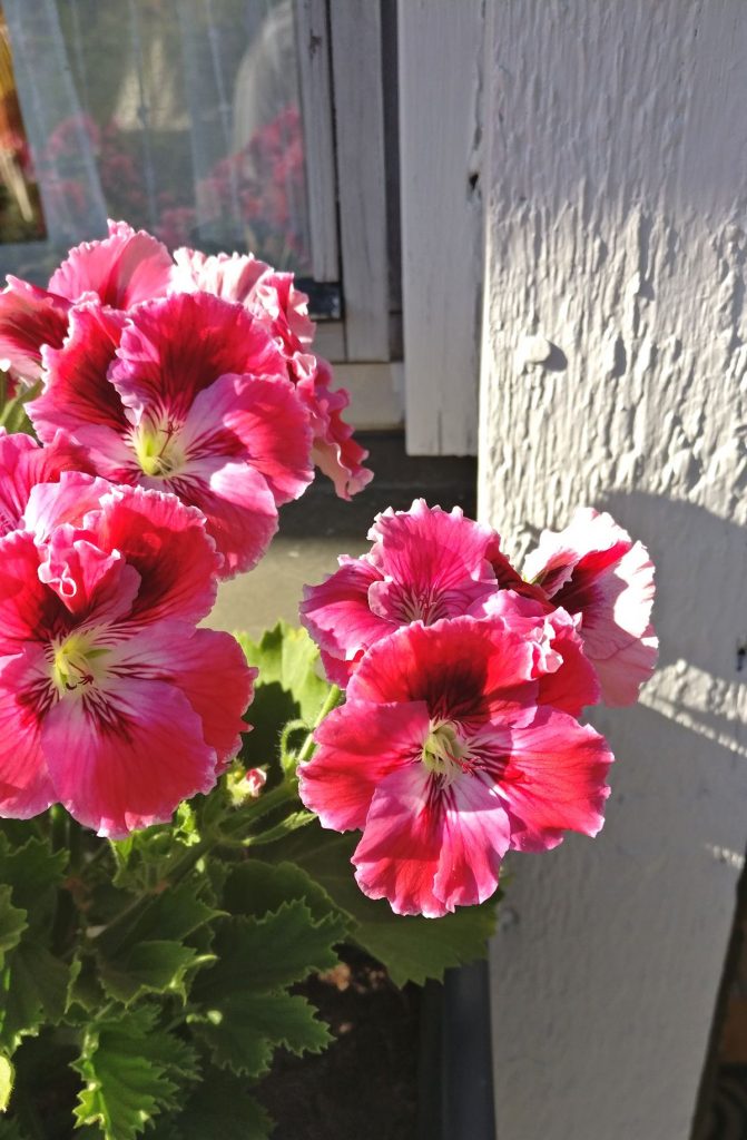 Oven viereisiin ikkunalaatikoihin laitoin jalopelargoneja. Nämä olivatkin minulle ihan uusi tuttavuus. Todella kauniita!