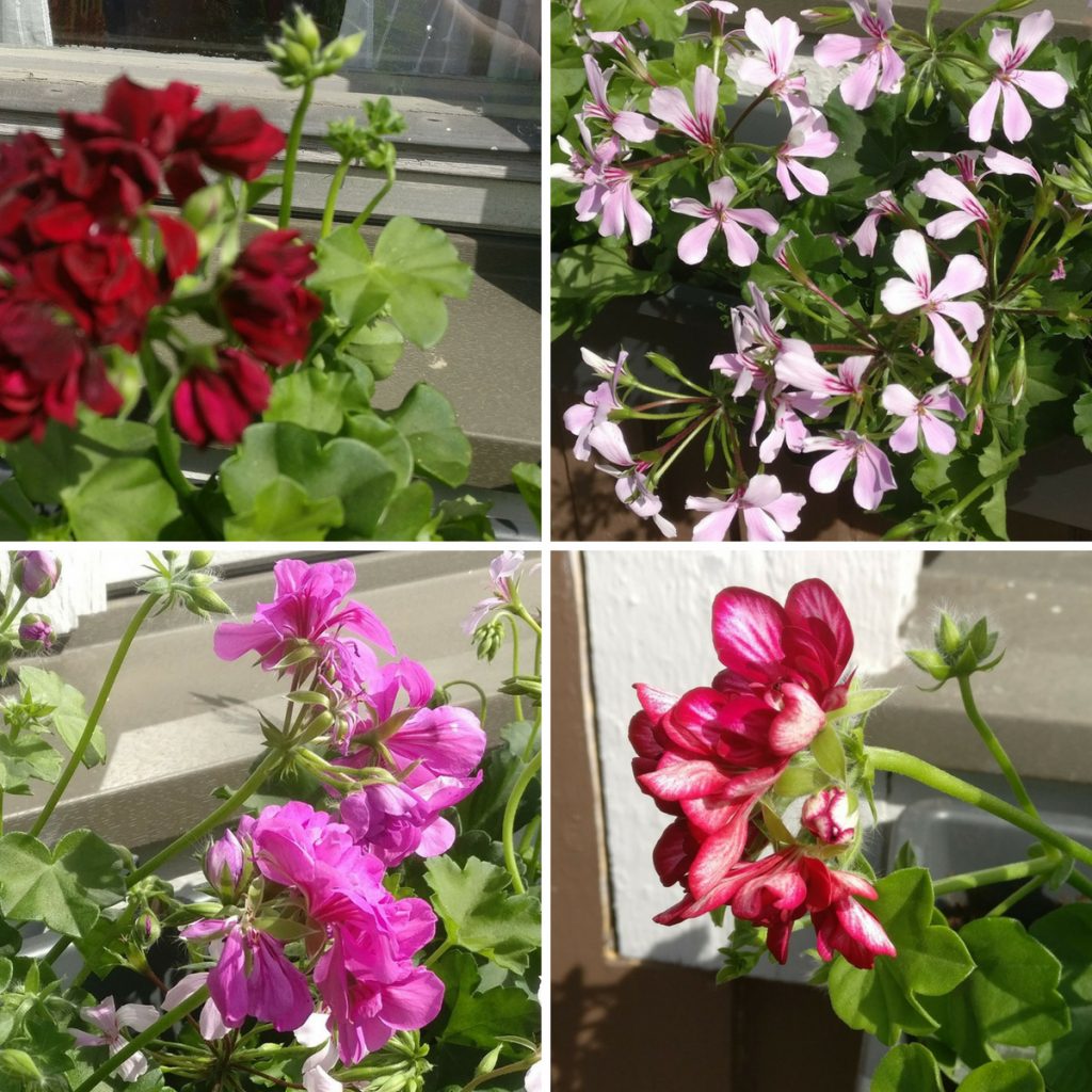 1. Upeuksia ja niin runsaina, hyvinvoivina. Itsekin laitoin parvekkeelle tänä vuonna vain pelargonioita ja pinkkiä sekä muitakin  värejä vähän kuin sekaisin, riippuvia piti olla mutta osa on kyllä seisovia. Nuo taitaakin olla daalioiden lisäksi ainoot jotka nyt viihtyvät kun on meinaan 38 astetta niin kaikki kuihtuu. (parvekkeella oli jo 50 astetta )Daaliat ovat ruukuissa ja maassa puutarhassa.