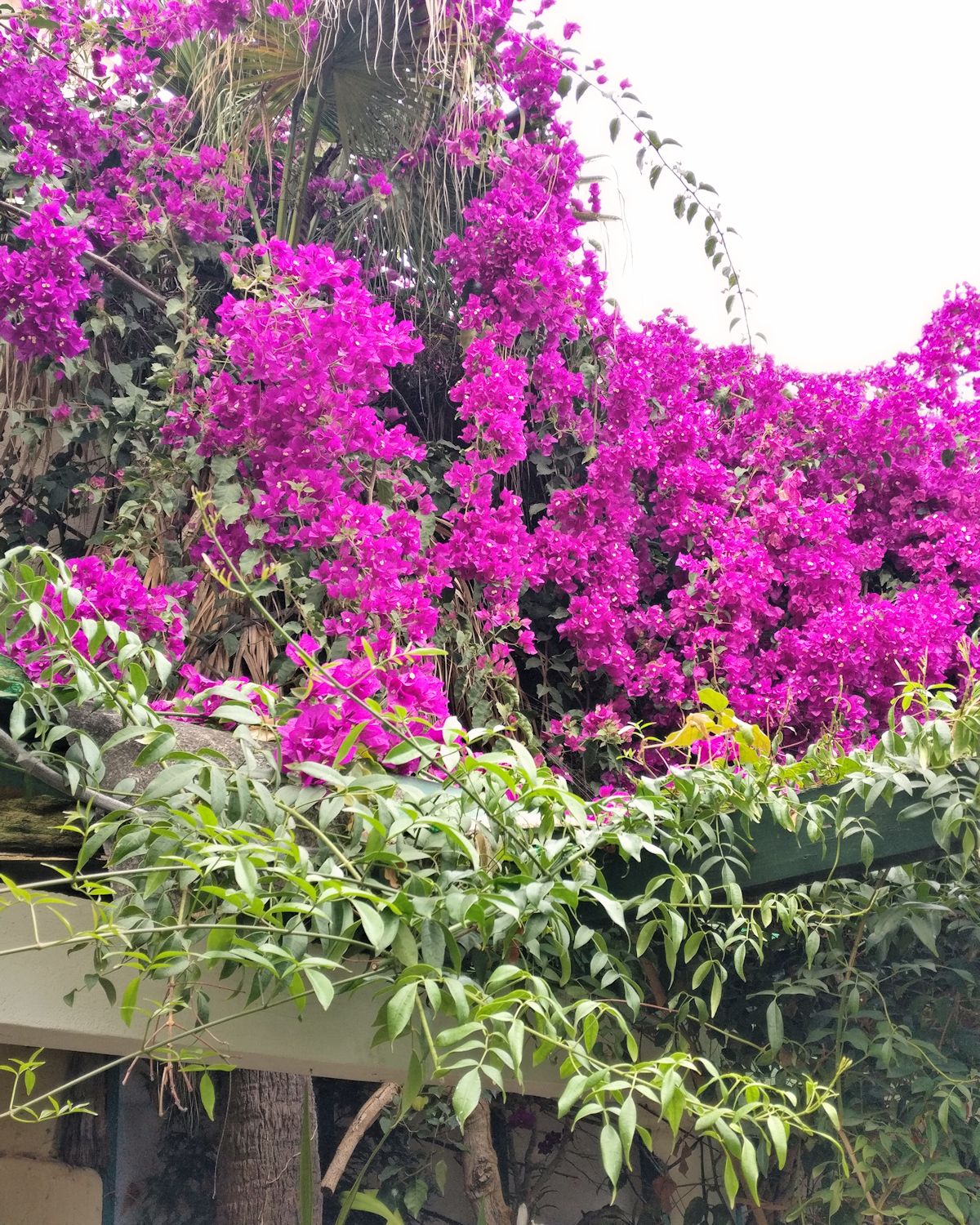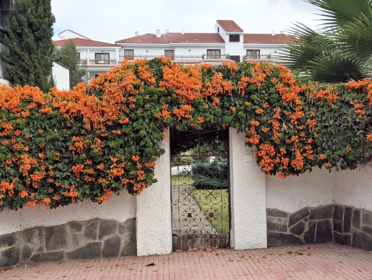 Myös Teneriffalla on nyt talvi. Lomallemme sattui kuulemma huonoin sää vähään aikaan. Paikalliset olivat kyllä tyytyväisiä sateeseen pitkän kuivan jakson päätteeksi. Onneksi emme ole kumpikaan rantaihmisiä, joten huono sää ei pilannut lomaa sen kummemmin. Vuodenaika ei tietenkään ollut paras puutarhamatkaajalle, mutta monenlaisia kauniita kasveja tuli silti nähtyä.  Erilaisia köynnöksiä oli käytetty paljon aitojen ja porttien sekä pergoloiden verhona.