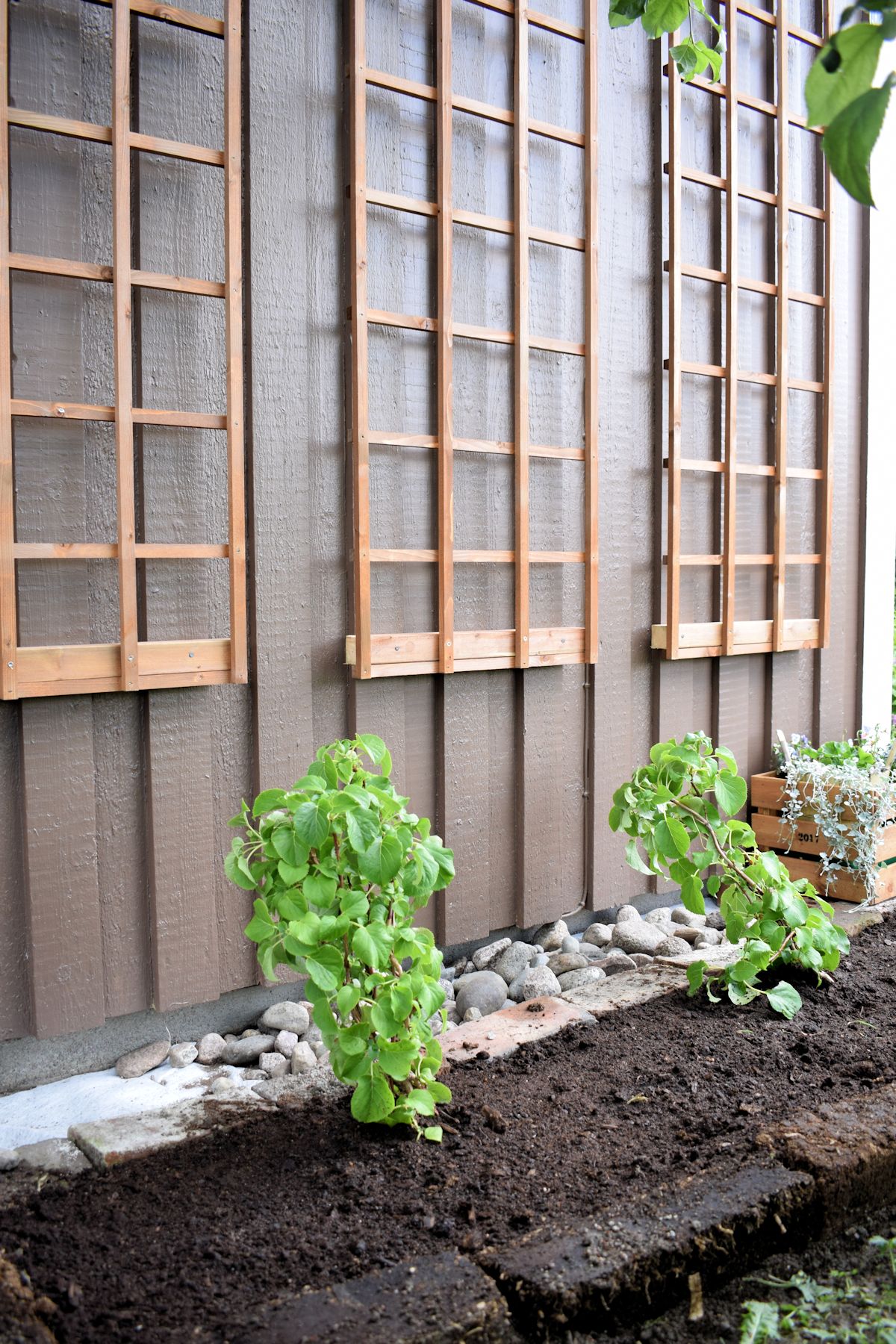 Varjoisen etupihan seinustasta tulee tosi kiva kun köynnöshortensiat täyttävät ritilät.